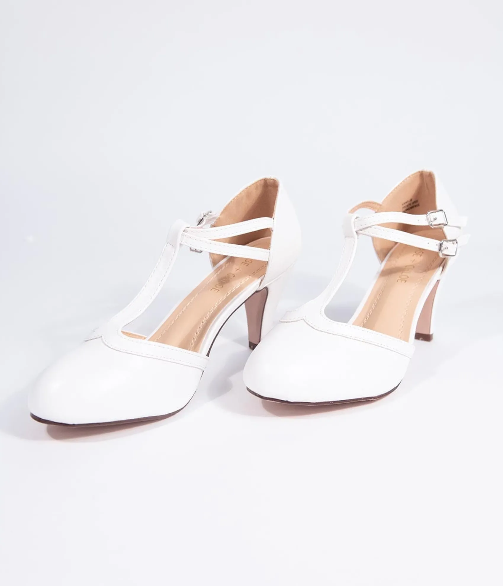 Vintage Style White Leatherette Round Toe T-Strap Heels