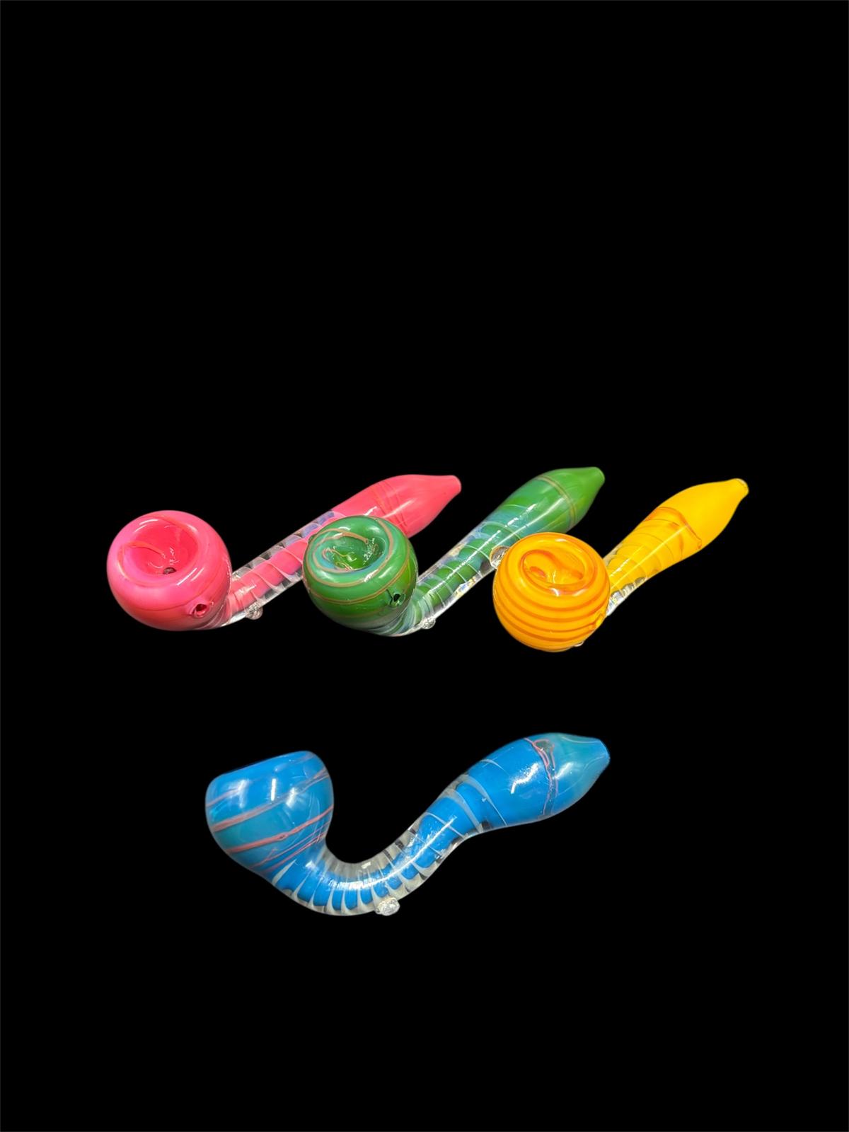 BRAND NEW GLASS SHERLOCK PIPE WITH COLOR GRADIENT DESIGN. COMES IN A VARIETY OF COLORS AND DESIGNS.